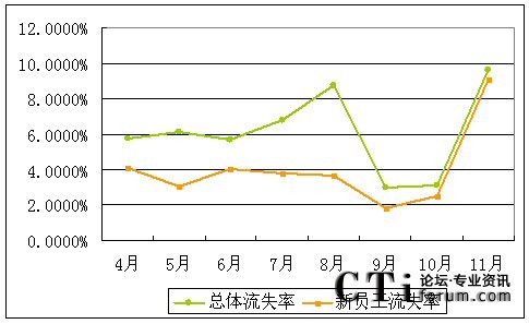 从上表中可以看出,该呼叫中心的总体流失率在4-11月期间并没有呈现特别的趋势性,11月份流失率的突增原因是在于该月有大量新员工(入职3个月内的员工)流失,占到该月总流失人数的94.12%。