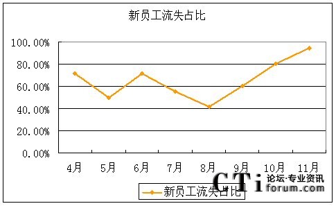 而对流失员工的结构性分析我们发现,4-11月期间新员工流失占总体流失人数的比例在不断上升,4-8月基本在50%上下波动,而从9月份开始直线上升,到11月份更达到了占到流失总人数的94.12%。当月有16名入职不到三个月的新员工离职,而老员工只有1人离职。