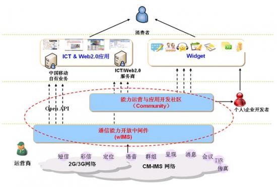 将运营商的通信能力通过API和Widget封装成各种组件,以搭积木模式,将组件提供给第三方业务提供商和普通开发者,从而使通信能力和业务快速的融入互联网或企业的OA办公系统中。