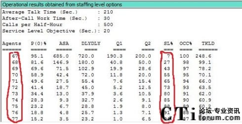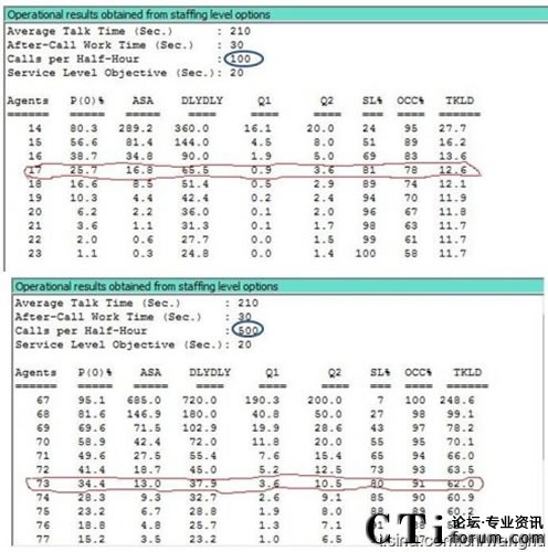 规模效应——同样的处理时长,同样的服务水平要求,当坐席组的规模不同时,其工作效率也会不同。如图所示,处理100个电话时,需要17个人;而当处理500个电话时,只需要73个人,而不是17X5=85个人。因此,呼叫中心的技能和坐席组的设置一定要考虑专业分工与规模效应的平衡。