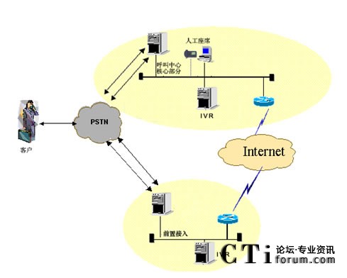 当客户在当地进入时,首先由分公司的本地IVR为客户服务,如果客户需要人工服务,系统会将其呼叫转接到公司总部的人工座席处(方式是通过IP网络),由总中心座席员为其进行服务。