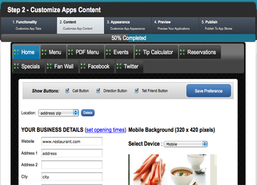 Bizness Apps采用可视化操作界面,用户只需要点击设置相关选项就能完成应用的开发工作。因此,Bizness Apps很适合缺少专业技术人员的小企业开发本行业应用。利用Bizness Apps开发行业应用只需五步。首先,开发者选择对应的行业后,需要为应用添加功能组件。第二步,为订制好的功能组件添加内容。第三步,为应用选定外观的设计方案。第四步,预览经过定制后的应用。最后,完成付费后即可发布你的应用。