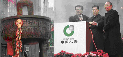 1月8日上午10:30,中国人寿大厦楼前披红挂彩、狮舞龙腾,中国人寿保险股份有限公司接受中国人保、中国再保、中国信保礼品馈赠仪式在热烈而隆重的气氛中顺利举行。三家公司向我公司馈赠了包括两只宝鼎和三只水晶花瓶在内的珍贵礼品,中国人保的唐运祥总经理、中国再保的戴凤举总经理、中国信保的唐若昕总经理先后发表了热情洋溢的讲话,祝贺我公司双喜临门:纽约、香港成功上市和乔迁新大楼,我公司总经理王宪章代表公司接收了三家兄弟公司馈赠的珍贵礼品并致感谢辞,他祝愿四家公司将中国民族保险业更加发扬光大。公司副总经理苗复春主持了此次捐赠仪式,出席此次馈赠仪式的还有集团公司和股份公司总经理室的各位领导、各部门总经理和员工。