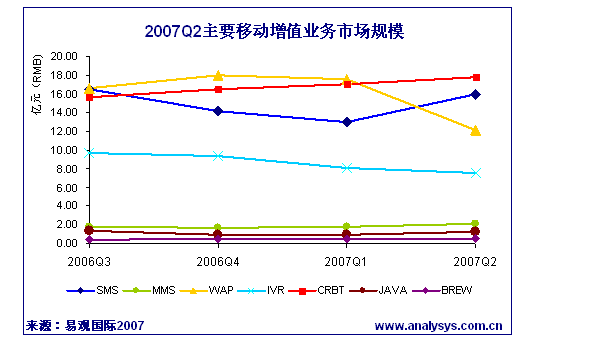 易观国际研究表明,2007年第2季度移动增值服务整体市场规模为57.42亿元,同比下降2.33%。其中彩铃业务收入居首位达17.75亿元。