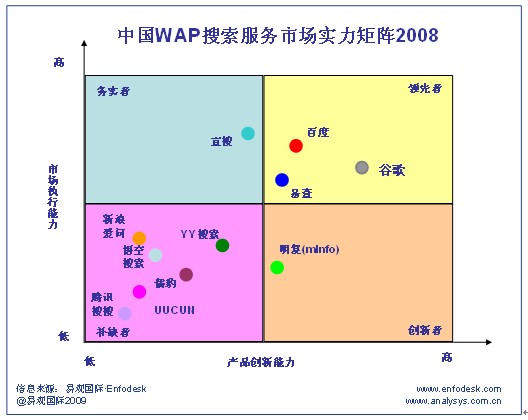 CTI论坛(ctiforum)06月16日消息: 据易观国际Enfodesk近期发布《中国移动搜索市场实力矩阵专题报告2009》显示, 对于WAP搜索服务市场,2008年移动搜索厂商对于用户的争夺和地域、渠道的卡位竞争越发激烈,用户市场格局已趋于清晰,领先者和市场补缺者两极分化格局明显。而对于该服务的商业模式仍处于继续摸索阶段,但较早尝试市场规模的厂商已稍有成效,而其他厂商也逐渐重视商业模式的构建。
