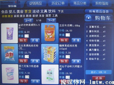 记者在家乐福IPTV购物平台上看到,商品的种类相当丰富,按日常用到的分成了食品、婴儿、美容、百货、运动、文具、饮料几个大类,而每一类里又分成不同的小类,比如美容类里又分护肤、清洁、男士、彩妆、纸巾等小类。其价格与在家乐福购物相同,并且还有不少产品在打折。满118元即可免费配送,对于没有时间、精力逛超市的人来讲,可以说相当方便。