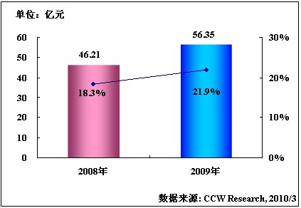 2009年3G时代到来,意味着各种新技术的应用和个性化业务不断推出。三家运营商之间基于3G业务的竞争也更为激烈,为适应市场激烈竞争的需要,电信运营商3G网络的建设步伐相比于2G网络建设大大加快。运营商电信业务支撑系统的整合需求将越发迫切,由此催生大规模的系统升级和优化等IT需求,因此3G时代为电信行业业务支撑系统BSS软件市场发展提供机遇。计世资讯(CCW Research)的调研结果表明,2009年中国电信行业业务支撑系统BSS软件总体市场规模为56.35亿元人民币,同比增长21.9%。