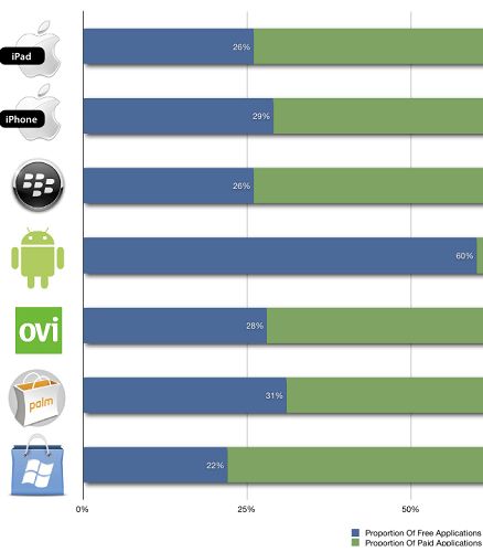 Windows市场中的免费应用程序比例最少,仅占其应用程序总量的22%;其次为苹果iPad应用程序商店,其免费应用程序比例为26%。iPhone应用程序商店中,免费应用程序的比例为29%。在付费应用程序方面,Android市场及Palm公司应用程序商店中前100名热销应用程序价格平均值高于所有收费应用程序价格均值。