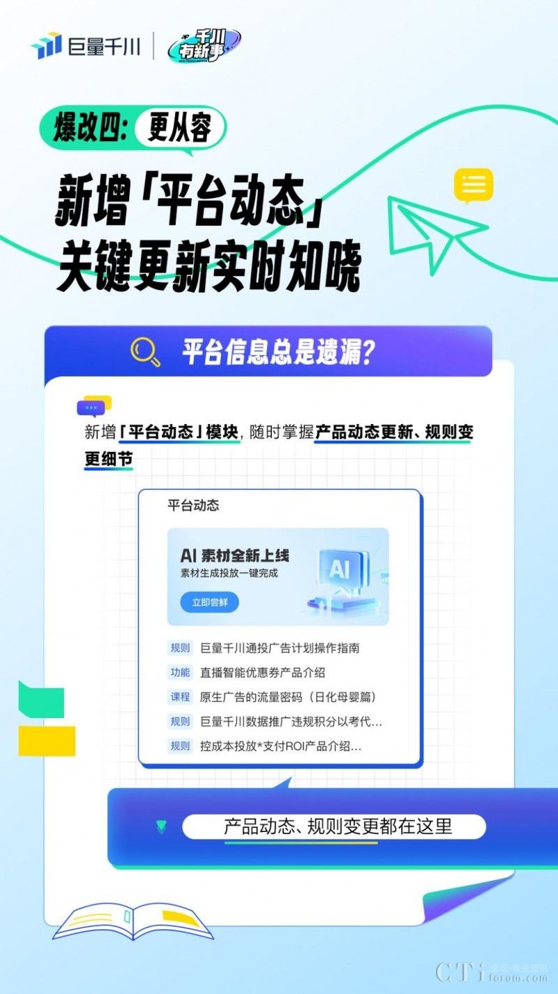 巨量千川首页升级还增设了「平台动态」模块,实时呈现平台产品更新、规则变更等信息,让商家可以及时了解平台最新动态,把握生意增长机遇。