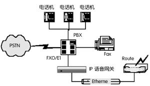 在这种应用方式中, IP语音网关采用FXO接口与PBX(用户电话交换机)互连,电话直接接入PBX,未接入PBX的外部电话,经电话公网(PSTN)与PBX相连。