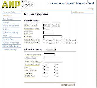 设置好中继后,现在AAH就与你的VoIP服务提供商建立好连接了,接下来就是使用“Add an Extension”页面(图5)来设置你的电话了,每一个Extensions选项必需指定一个名字、数字和密码,还可随意给它指定一个语音信箱的目录。