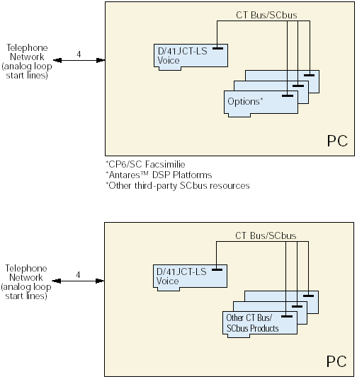 使用D/41JCT-LS板卡和CT总线时,来自网络板卡或其他资源的数字语音和资源通过H.100接头和CT总线接口进入板卡。由一个CT612芯片管理这些信号,并且作为通道协调器和矩阵交换机来缓存来自总线的高速信号数据,直到每个通道的数据发送到DSP。