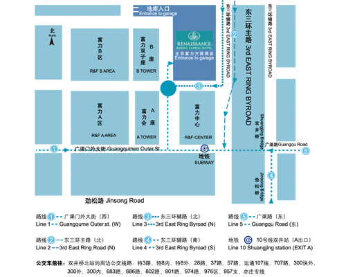 场馆交通信息 名 称:北京富力万丽酒店 Renaissance Beijing Capital Hotel 公 交:特3路/特8外环主路/特8快车内环/特8内环主路/特8快车外环/特8外环/特8内环/28路/7区间(高峰车)/37路/57路/运通107线/214夜班/300内环 300快车内环/300快车外环/300外环/348路/683路/686路/707路/801路/802路/974路/976区间 双井桥北站下车 地 铁:10号线双井站下