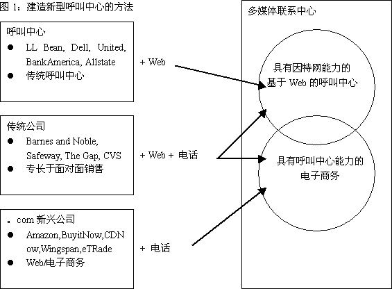 所有的公司都迫切希望找到一种途径,使自己拥有“具有因特网能力的、web集成的呼叫中心”或“具有呼叫中心能力的电子商务网站”。图1所示为实施方法的一个实例。但是,不管你如何称呼它,如何达到目标,你都会面临处理多媒体联系的挑战。多媒体联系中心包括通过电话签定合同和处理来自web的合同,可能是通过电子邮件,文本交谈,电话呼叫,或通过web的语音呼叫。并且,大多数时候是由同一组人处理多种媒体服务。